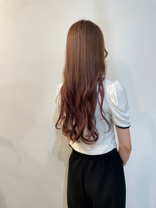 全体をブリーチなしでブラウンからピンクのグラデーションに仕上げさせて頂きました^ ^ブラウンにもピンクを混ぜクリアなブラウンと全体の馴染みが良くなるようにこだわりました。
